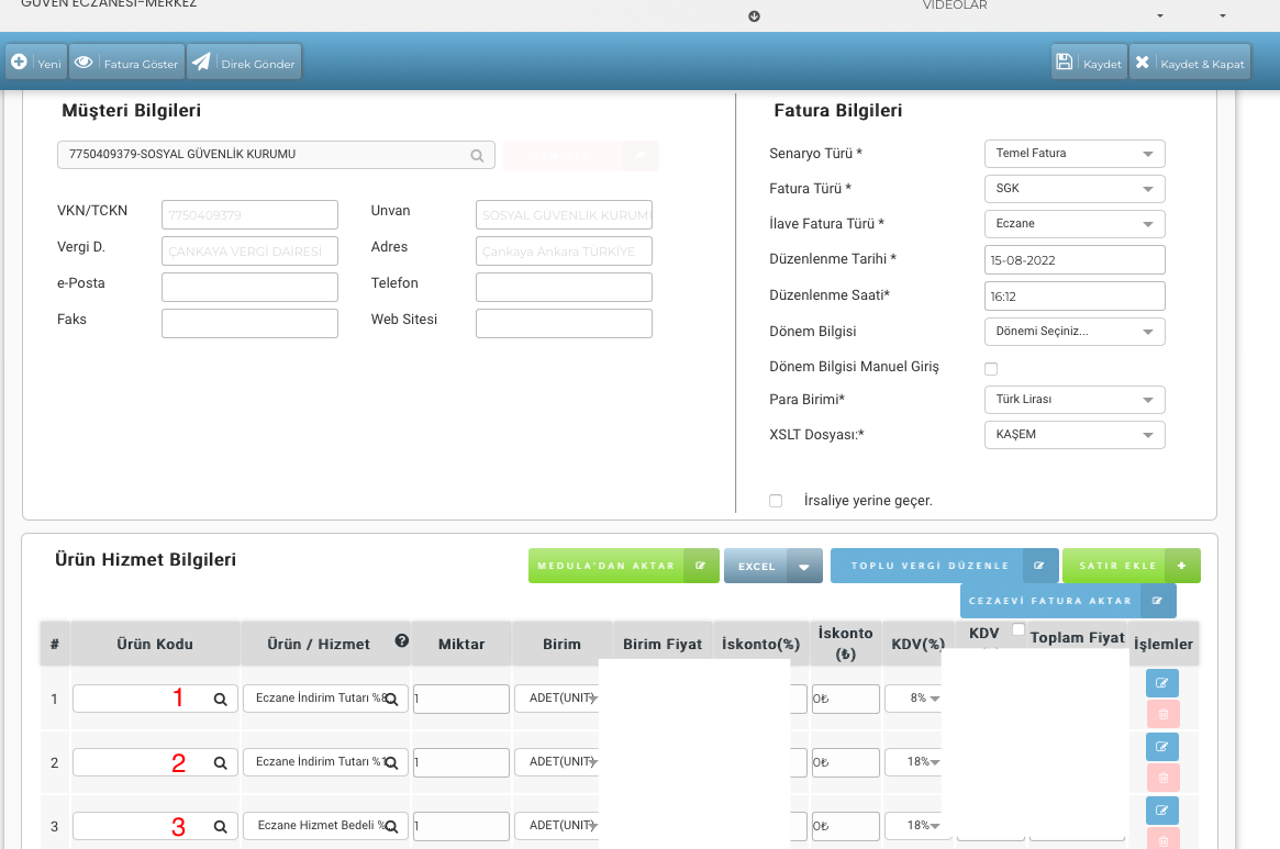 Meduladan aldığımız dökümdeki KDV dahil ve hariç tutarlar dikkatle kontrol edildikten sonra, tutarlar doğru ise fatura kaydedilir ve son kontrolden sonra GİB gönderimi yapılarak çıktı alınır.