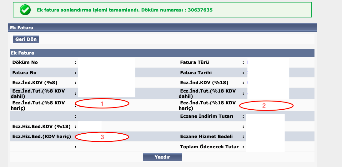 6) Tekrar Medulaya dönülür. Burada 3 tane kırmızı rakam grubu bulunmaktadır. Bunlar Eczane indirim Tutarı %10 KDVli, Eczane İndirim Tutarı %20 KDVli ve Eczane Hizmet Bedeli %20 KDVli şeklindedir.